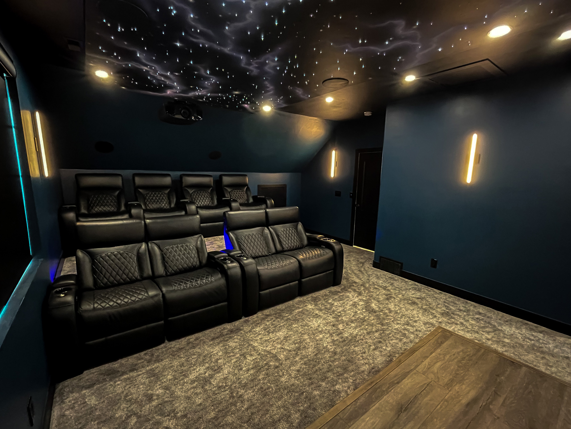 Relax and recline in plush, customized theater seating featuring beautiful woods, fabrics and leather finishes applied to chairs, loungers and chaises.